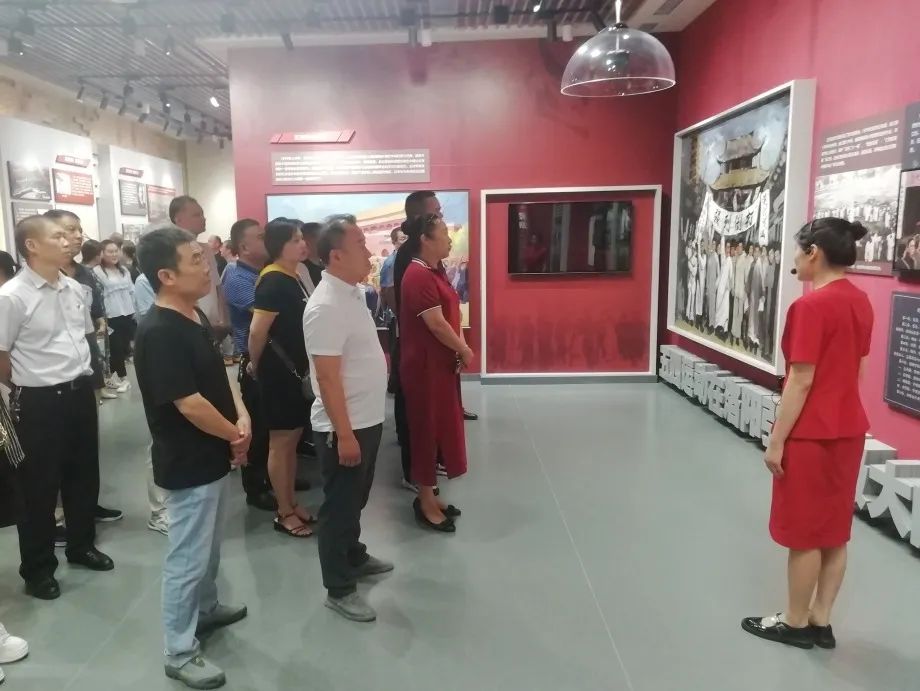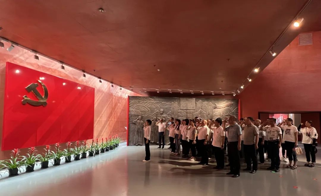 在纪念馆一楼大厅的宣誓墙前,全体党员面对鲜红的党旗,庄严地举起右手,重温入党誓词,再次擦亮入党初心,燃起砥砺前行的豪情壮志。