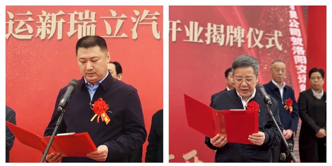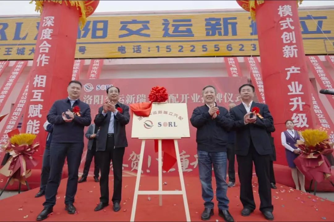河南省道路运输协会会长吕全德、瑞立集团董事长张晓平、交运集团党委书记、董事长胡斌,党委副书记、总经理冀鹏德共同为洛阳交运新瑞立汽配有限公司揭牌。