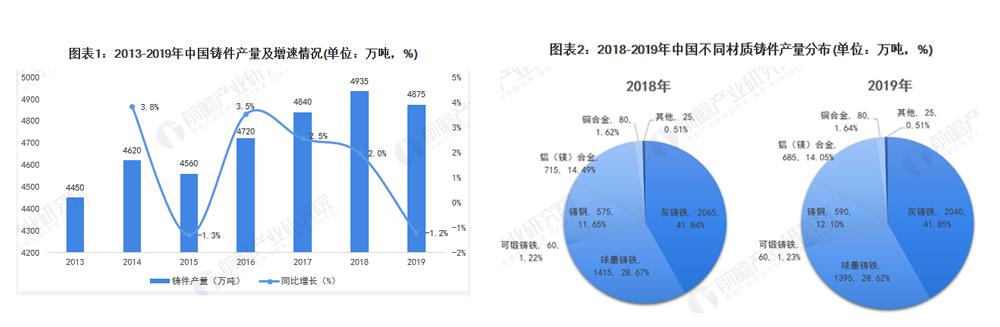 2020年6月,中国铸造协会发布《2019年中国铸造行业数据》。首先从中国铸件产量情况来看,由于我国工业发展较快,其中以装备制造业等新兴产业的快速发展,为我国铸造行业带来了强有劲的行业需求,带动行业产量的不断提高,2013-2019年,我国铸件产量整体呈现波动变化态势。其中2019年中国各类铸件产量为4875万吨,同比下降1.2%,出现小幅下滑。但从整体来看,行业产量处于较高的水平。