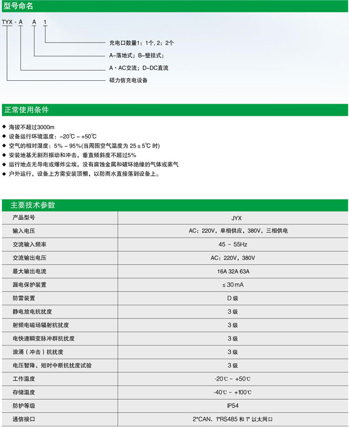 JYX系列交流充电桩主要用于对电动汽车进行快速充电。该产品安装在户外,防水,防尘设计,防护等绷P54。本产品将充电接口、人机交互界面、通信、计费等部分集成为一个整体,采用模块化设计,具有安装调试方便、运行维护简单等特点,与充电机配合使用,是电动汽车户外交流充电的理想选择。
