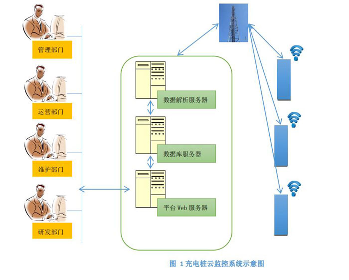 系统主要有充电桩,传输组件,远程管理服务平台等组成,它建立了充电桩实时在线的数据通信,采集,控制和存储网络,充电桩数据终端实时获取充电桩内部数据和各种采集状态信息,将这些数据通过移动 4G 无线通信或局域网有线网络信号发送到远程管理服务平台,用户通过连接到网络中的计算机或手机对充电设备数据进行监控和远程管理。
