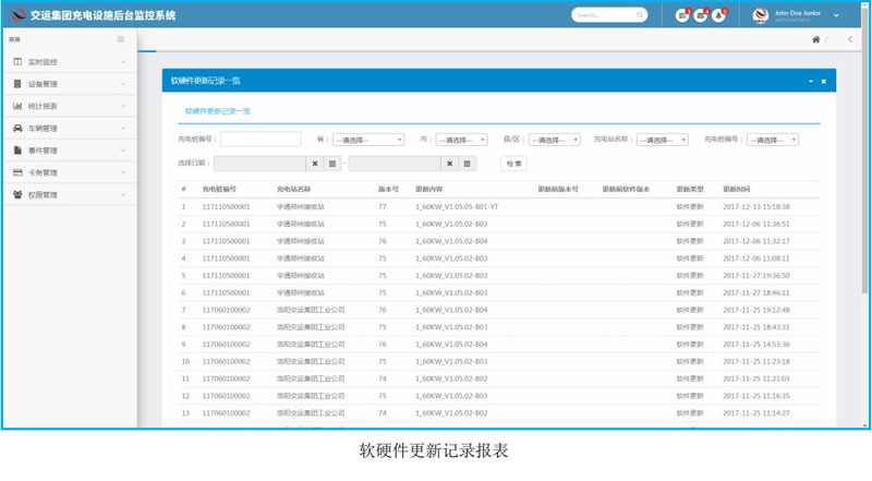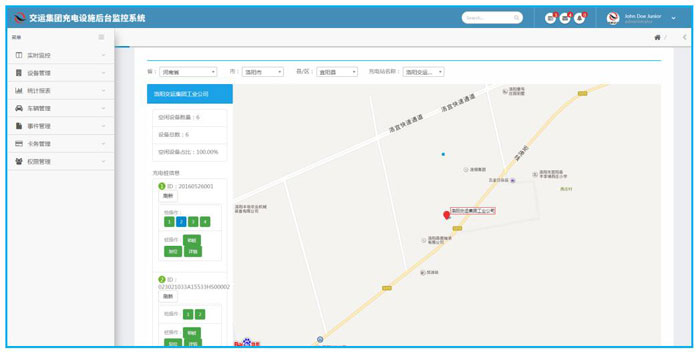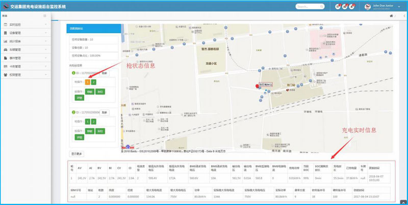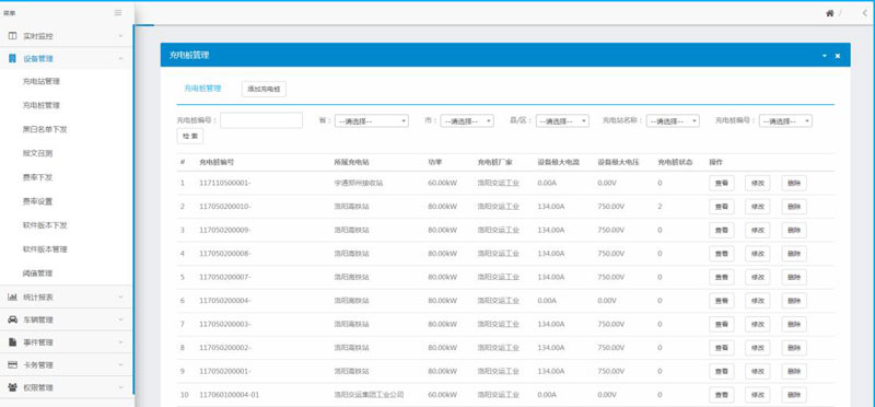 通过设备管理模块能够灵活实现对充电站和充电桩的添加、修改、删除、数据信息管理、统计、状态查看以及黑白名单的下发、报文召测、费率的设置与下发、充电桩主控程序的上传及远程更新、充电桩阈值管理等功能。