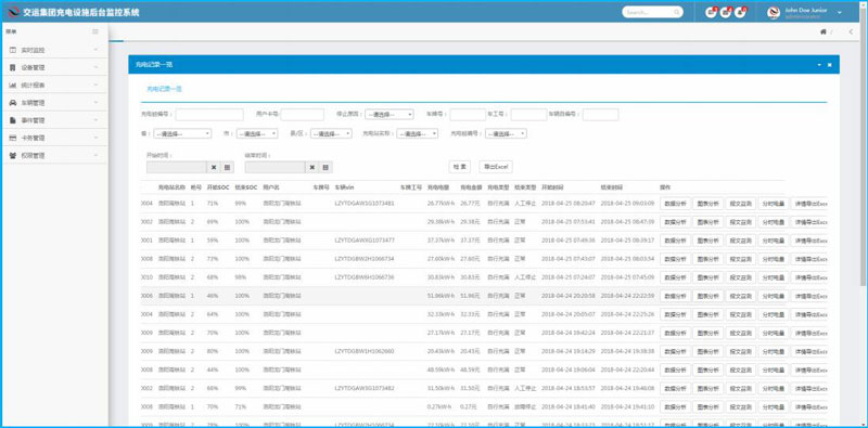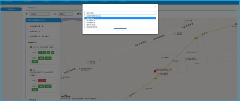 通过筛选框,精准查询充电站/充电桩,并在弹出的充电设备列表中查看属性和状态,并进行“充电”、“停止”、“复位”、“详情(实时数据)”等操控功能。