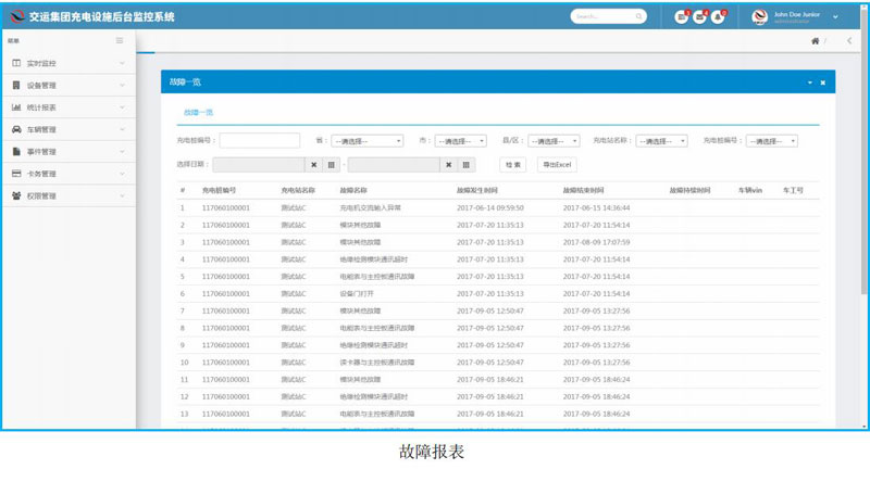 通过统计报表模块能够实现对充电桩信息数据、充电桩充电记录的信息查询并且可以查询到单次充电报文的详细信息、充电桩故障数据的查看、消费费用记录的数据查询、报文召测的信息查询、充电桩主控程序更新情况的统计与查询,可以进行按条件检索、按地域检索,生成统计报表导出至 EXCEL,动态图表的生成,从而更直观、清晰的展示出数据的变化趋势等功能。