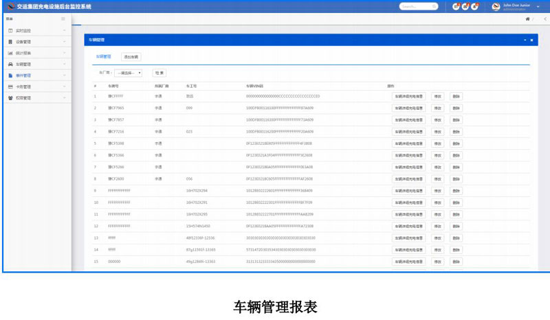 车辆管理模块主要是对在充电桩上进行充电的车辆信息进行监控与管理,通过提取车辆的唯一标识 VIN 码进行与车辆关联,可添加车辆从而与统计报表中进行与车辆关联,可添加车辆从而与统计报表中进行关系,查询出针对车辆的充电信息及充电过程中的数据变化趋势。