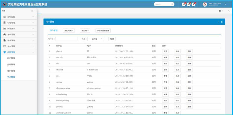 其中用户管理可实现对用户账号的新增、查看、修改、删除等功能,通过对用户账号的管理,可为用户分配相应的角色、负责的区域,角色具有固定的权限,同时用户账号的权限也可以超出角色的权限范围,无相应权限的用户不能使用系统中的相应功能。负责区域能够实现全国、省、市、县(区)、站的 5 级灵活定义,使用户账号的负责区域可以同时支持多省与多市并行管理等功能。